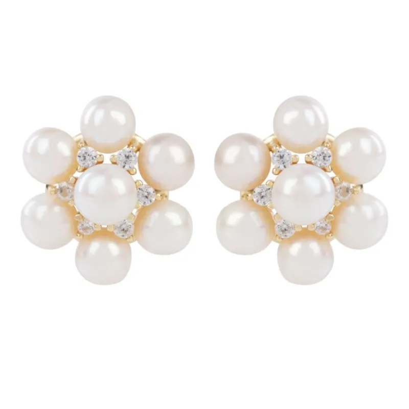 Stud Earrings With White Pearls Forming The Petals Of The Flower And A Cubic Zirconia In The Centre.