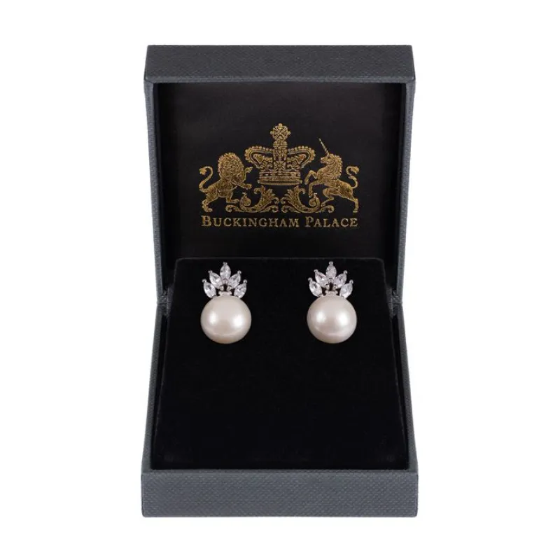 A Pair Of Striking Freshwater Pearl Earrings With A Magnificent, Surmounting Cubic Zirconium Crystal Crown Detail. Pearls Have Been Popular With Royalty For Centuries, Prized For Their Brilliance And Rarity They Were A Symbol Of Love, Purity And Beauty. Elizabeth I Was Often Painted Wearing Multiple Ropes Of Pearls And With Pearls Sewed Into Her Gowns. They Were Popular Too With Her Late Majesty Queen Elizabeth Ii And With Many Members Of The Royal Family.