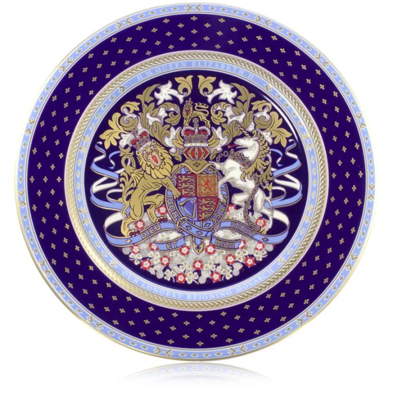 Queen Elizabeth Ii Became Britain’S Longest Reigning Monarch On Wednesday 9Th September 2015. This Momentous Milestone Surpassed Queen Victoria, The Great-Great-Grandmother Of Queen Elizabeth. To Celebrate The Occasion, This Exclusive Range Was Launched And Includes This Charming Commemorative Plate. At The Centre Of This Plate Features The Coat Of Arms Which Was Originally Printed On The Programme At The Coronation In 1953.The Plate Features The Sumptuous Rich Purple Colour Which Is Magnificently Achieved Through Use Of A Gold Based Pigment. Together With The 22 Carat Gold Gilding, The Resulting Decoration And Design On The Piece Is Essentially All Gold.This Plate Was Handmade, In England, Following Traditional Methods, Using Fine Bone English China, A Material Known Worldwide For Its Fineness.Not Suitable For Use In A Dishwasher Or Microwave.Diameter 28 Cm.