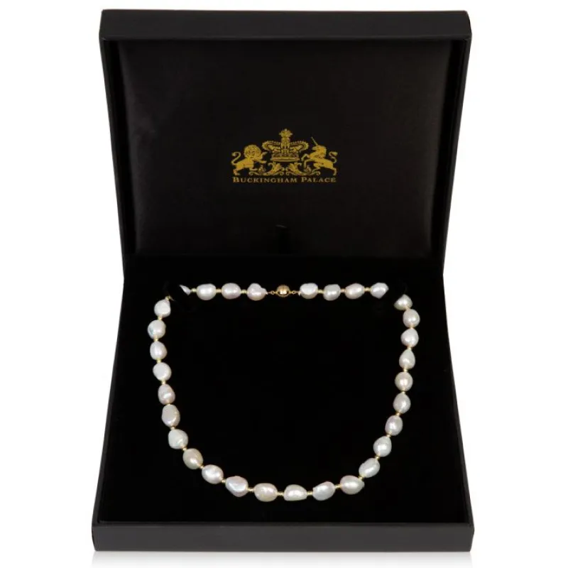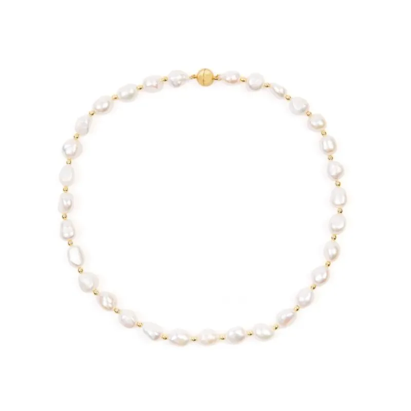 A Feminine And Elegant Necklace Of 10-11Mm Baroque Pearls Interspersed With Small Round Gold Plated Hematite Beads, On A Gold Plated Magnetic Ball Clasp.