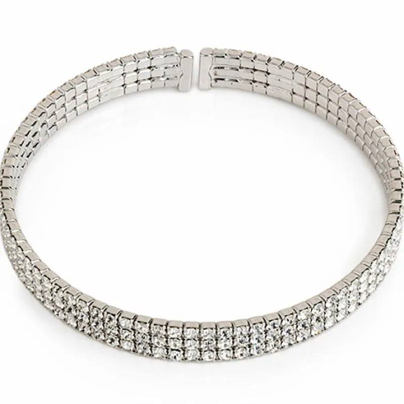 Consisting Of Three Rows Of Magnificent Crystals, This Striking Cuff Bracelet Is A True Statement Piece. Held In Rhodium Plated Base Metal, This Piece Would Make A Wonderful Gift.Flexible Bracelet.Circumference 16.5 Cm.