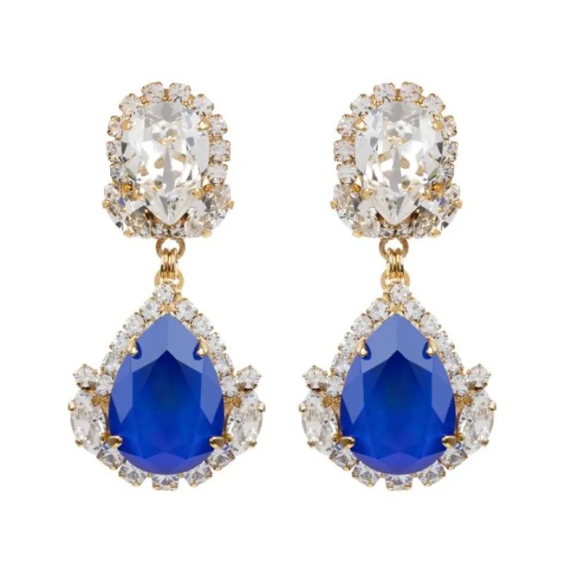 These Vibrant Blue Pear-Cut Crystal Pendant Earrings Are Inspired By The Timeless Pieces Worn By Her Majesty The Queen. Featuring Hand-Painted Brilliant Blue Crystals Surrounded By Glittering Clear Crystals They Are Perfect For Any State Occasion Or For Making A Statement.