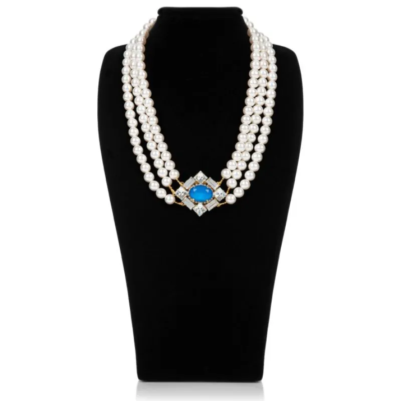 A Timeless, Three Strand Pearl Necklace Finished With A Hand-Painted Blue Crystal Inspired By Pieces Worn By Her Majesty The Queen.